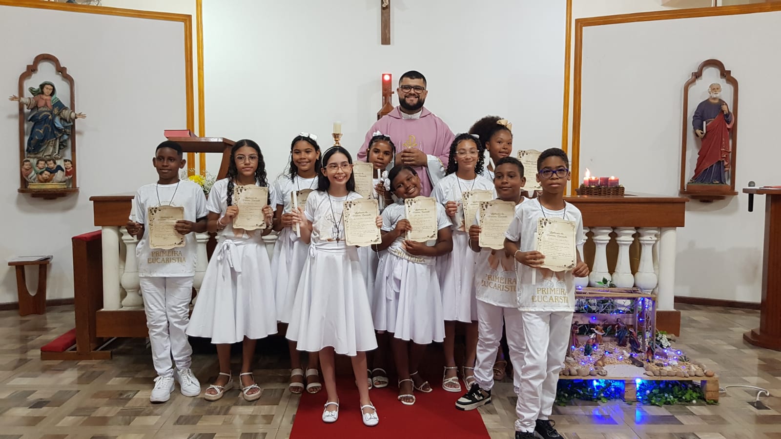 Ao todo, 52 crianças receberam pela primeira vez o Corpo e Sangue de Cristo, um momento especial na caminhada de fé das famílias e da comunidade. As celebrações aconteceram na Igreja Matriz e nas comunidades São Pedro e Perpétuo Socorro, sendo presididas pelo pároco, Pe. Fernando Pereira.