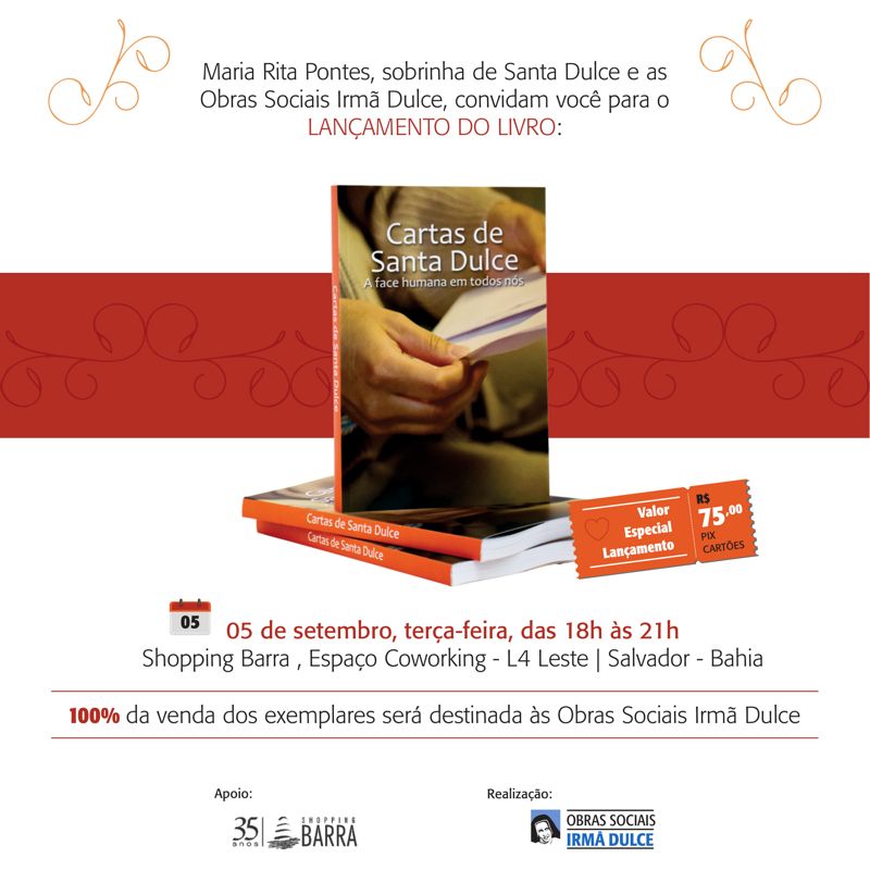 Com 100% de sua comercialização revertida para a obra social fundada por Irmã Dulce, o livro será lançado em Salvador no próximo dia 5 de setembro, às 18h, no Espaço Coworking, no Shopping Barra (L4 Leste). Já no dia 26 de setembro, às 19h, o lançamento será no Rio de Janeiro, no Instituto Superior de Educação Pró-Saber (Largo dos Leões, 70, Humaitá), quando também será realizada uma mesa-redonda. Em ambas as ocasiões, Maria Rita, que integra o conselho editorial da publicação, irá autografar os exemplares. Durante as duas noites, o livro estará disponível por um valor promocional de R$75. Posteriormente, a publicação estará à venda na Loja Irmã Dulce (Av. Dendezeiros do Bonfim, 161, Largo de Roma) na capital baiana, e na loja virtual (loja.irmadulce.org.br).