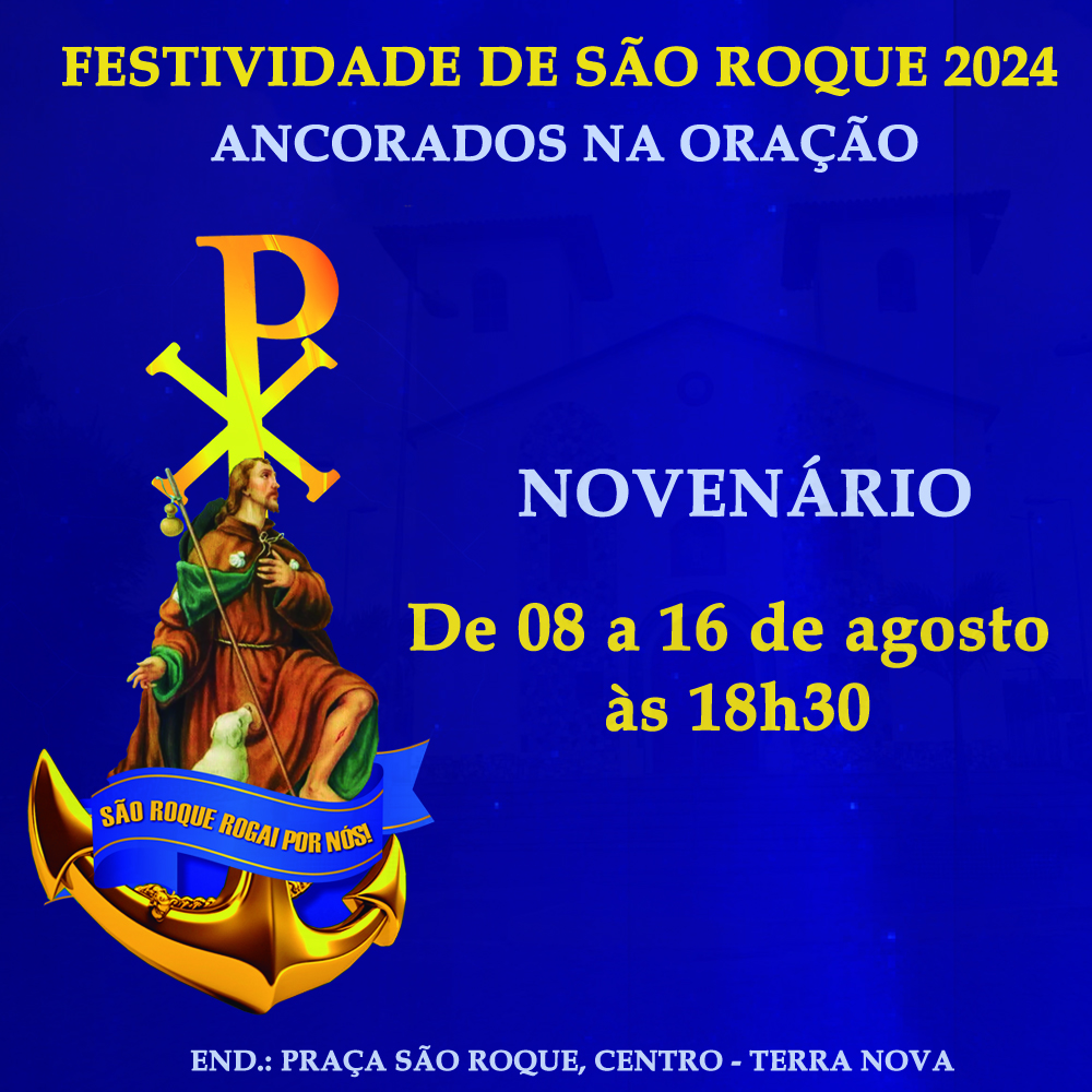 Com o tema "Com São Roque, Peregrino da Fé, vivenciar a presença de Jesus Cristo através da Igreja em oração - Ancorados na oração”, o novenário será realizado de 08 a 16 de agosto às 18h30 na Igreja Matriz.